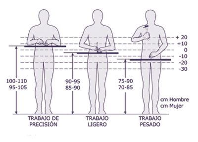 Aplicación para determinar altura de mesa de trabajo, en bipedestación. Evaluar la altura del trabajador (altura de codo) para trabajo pesado, ligero y de precisión.